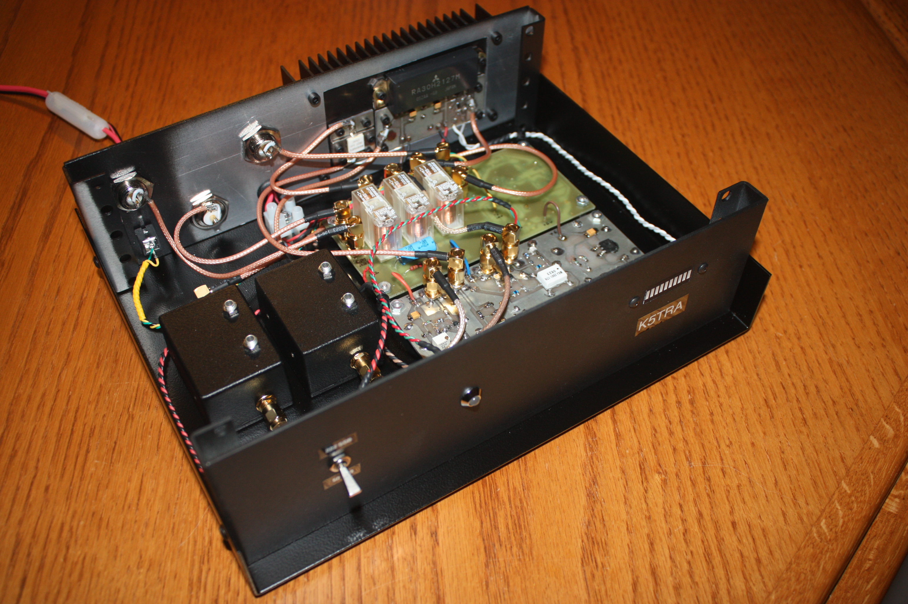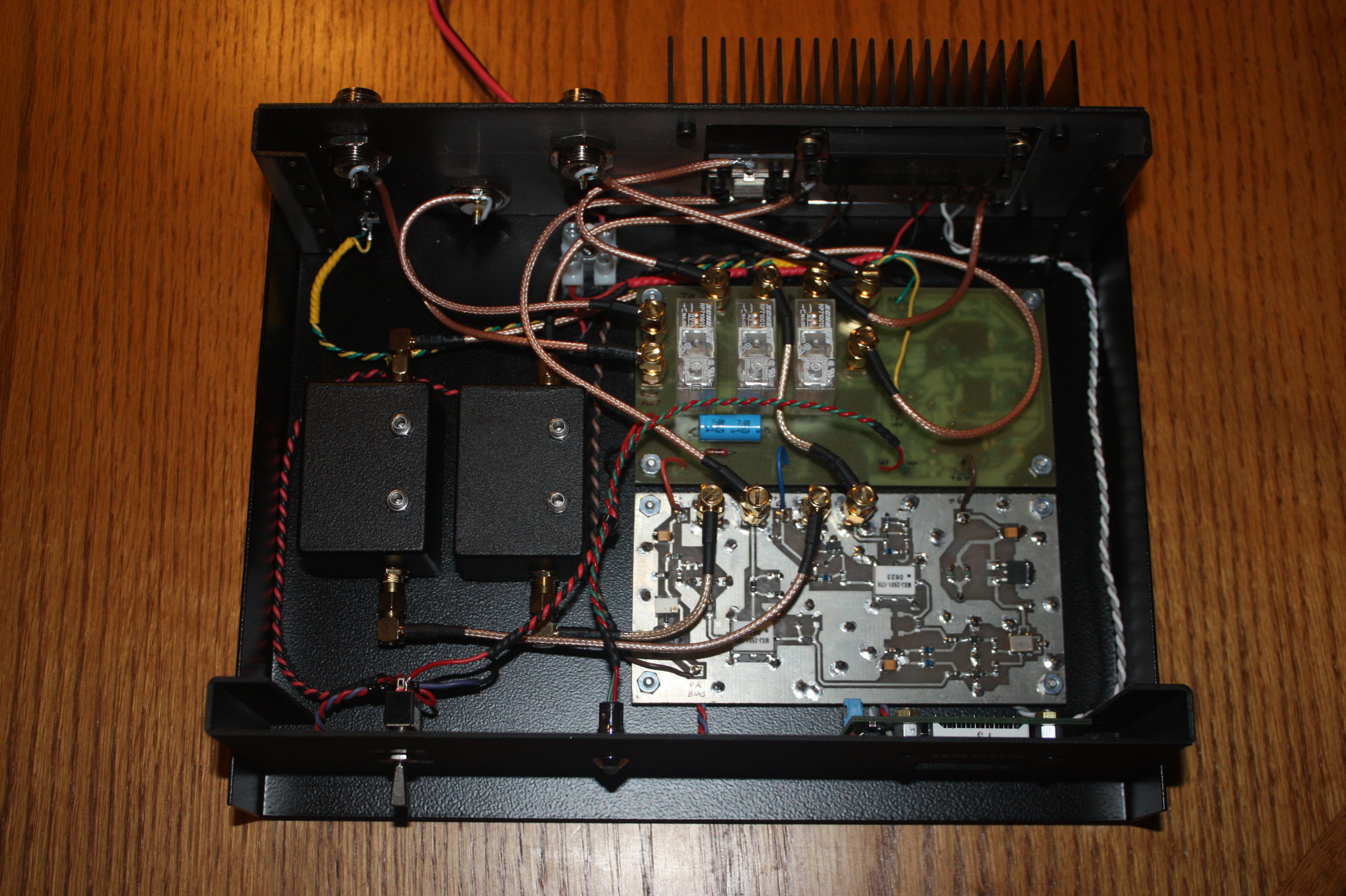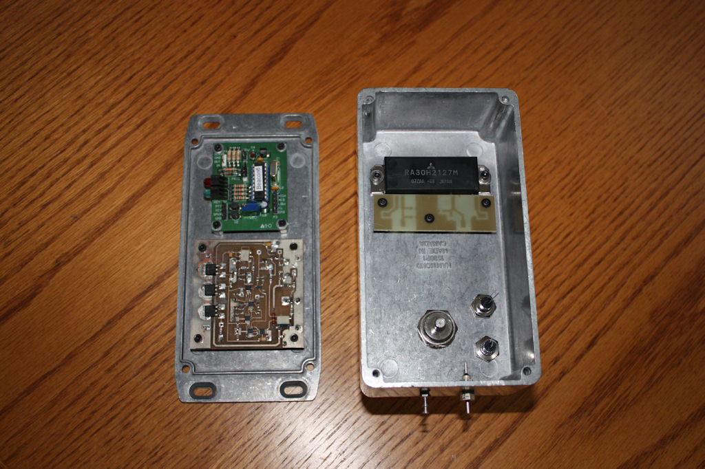 The transmit circuit following the up conversion mixer is helical resonator BPF. This filter is identical to the receive preselector. A driver circuit consists of a RFMD/Sirenza SGA-6386. The power amplifier is a Mitsubishi RA30H2127M module. The 50 MHz IF signal is attenuated by a 30 dB power pad followed by an additional pi pad of surface mount resistors.