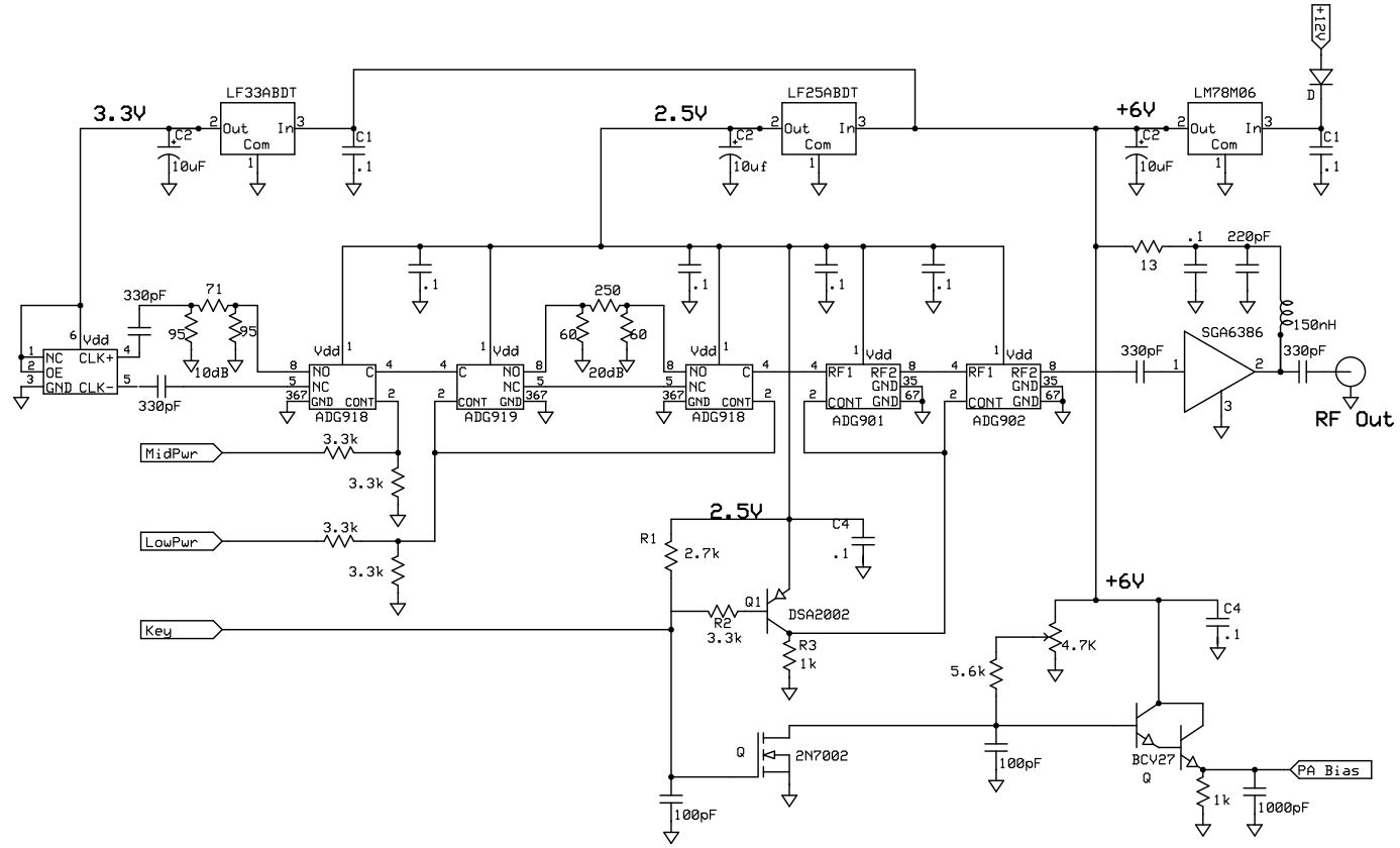 The beacon RF chain begins with a Silicon Labs Si530 source at 222.060 MHz. The CW output operates at three power levels: full power, -10 dB, and -20 dB. The power stepping is accomplished by switching in pi pads with Analog Devices CMOS RF switches. The two differential outputs of the Si530 are used to obtain the first two level steps. An ADG-918 SPDT switch selects either a direct output or a 10 dB attenuated output. The ADG-918 provides termination of unselected port, so LO pulling when ports are switched is minimized. The lowest level is obtained by using an ADG919 and ADG918 to select a direct path or a 20 dB attenuated path. CW keying is accomplished by a combination of RF switching and DC switching of driver and PA bias. The RF switching is through a cascade of ADG-901 and ADG-902. The ADG-901 provides LO drive termination at all times. The driver is a RFMD/Sirenza SGA-6386 and the PA is a Mitsubishi RA30H2127M module. This PA is capable of 40 Watts; however, for reliable beacon duty it is run at 10W output. The control for CW keying and level steping is provided by a Freakin' Beacon FB-1 board.