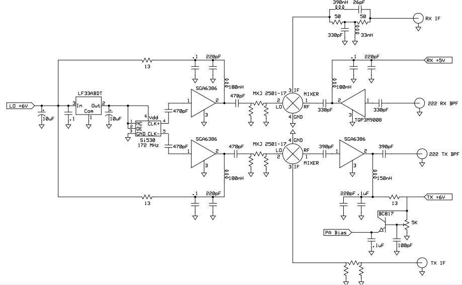 The IF frequency is 50 MHz. A 172 MHz LO is generated by a Silicon Labs Si530 chip. The differential outputs each drive a RFMD/Sirenza SGA-6386 chip to provide two buffered outputs. Each buffered LO output drives a double balanced diode mixer. A PDI MXJ-2501-17 (level 17, low conversion loss) is used in both the receive path and the up-conversion transmit path.