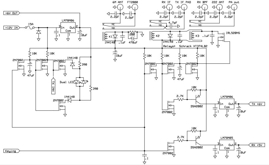 RF switching is provided by three, 12V, SPDT board mount relays. These are RP710012 made by Schrack. The path inductance is approximately 13 nH. All switched RF paths are compensated with shunt caps to form a pi LPF. Driver circuits for relay switching, sequencing, and switched bias circuits are all accomplished with self contained analog circuitry. When the transverter is in the OFF position the IF radio is switched to a 6M antenna port on the rear panel. A single +12V power supply is required for operation.