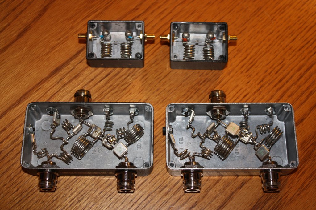 Due to limited number of 9913 coax runs to the antenna farm, 222 MHz and 50 MHz operation share a common feed. Home brew crossband couplers (band split diplexers) provide separate radio and antenna interfaces with only a few tenths of a dB loss and 60 dB of isolation. Operation at 200W on 6M is no problem due to use of transmitting micas.